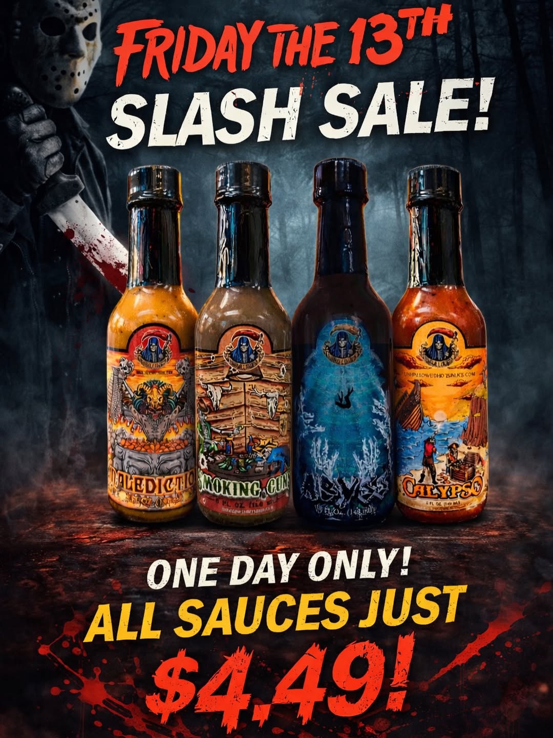 For this Friday the 13th only, we’re slashing prices on every bottle in the shop. For one day, all artisan hot sauces are just $4.49 each!